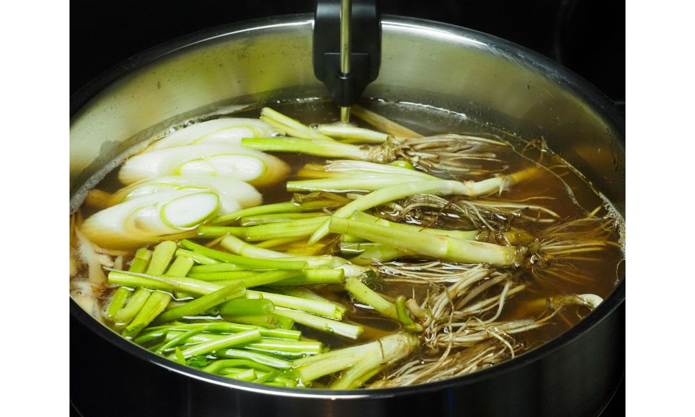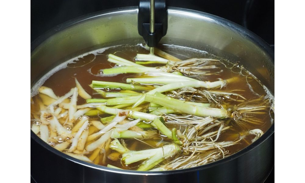 Reproレシピでは、この後85℃まで放熱して、85℃をキープします。まずはせりの根やごぼうなど火が通りにくいものから入れていきます。