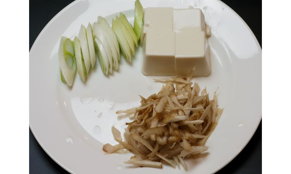 ごぼうはささがきに、豆腐は4cmぐらいの角切りに、長ねぎは斜め小口切りにします。