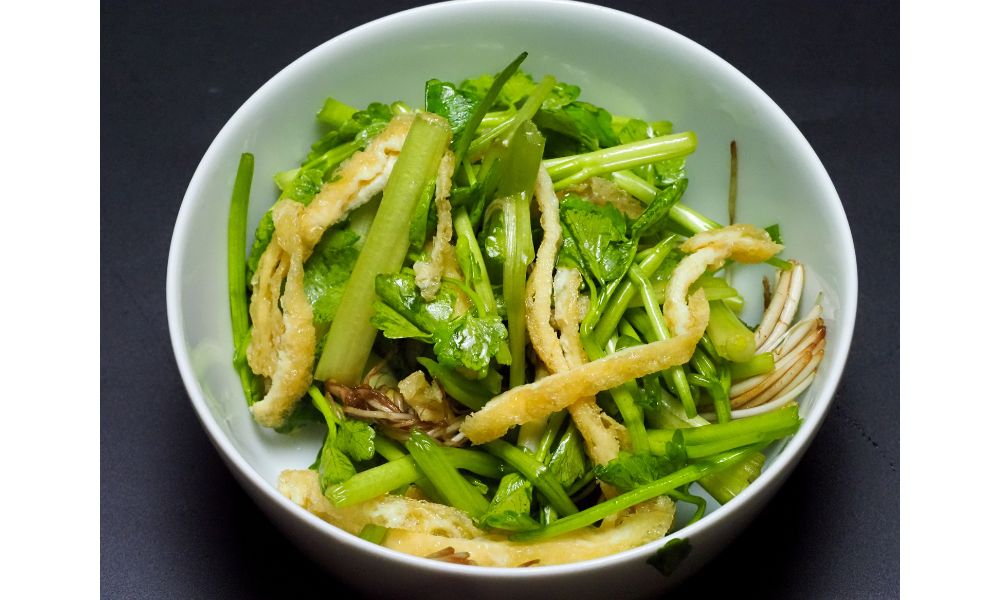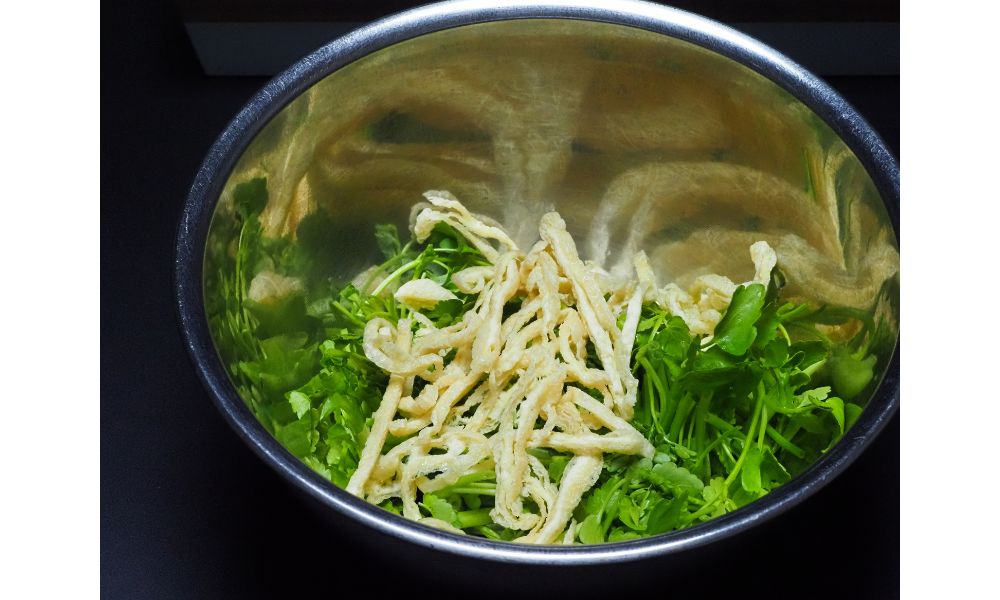 後は炒めた油揚げとせりをボウルに入れて調味料をかけて混ぜ合わせれば完成です。