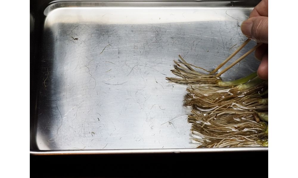 そしてここが一番 手間がかかる部分。バットなどに水を溜め、根の間に付いた土を掃除します。昔ながらのやり方は竹串2本を箸のように使いきれいにしていきます。