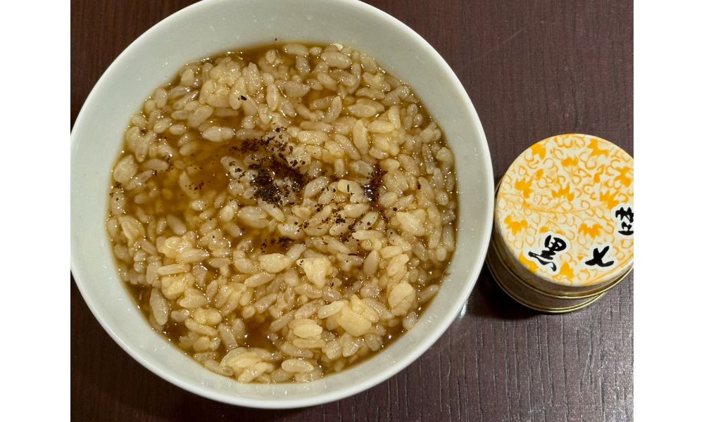 何か雑炊に合うものは?と思い、最近 京都の知人からいただいた原了郭の黒七味を少し振りかけてみると…