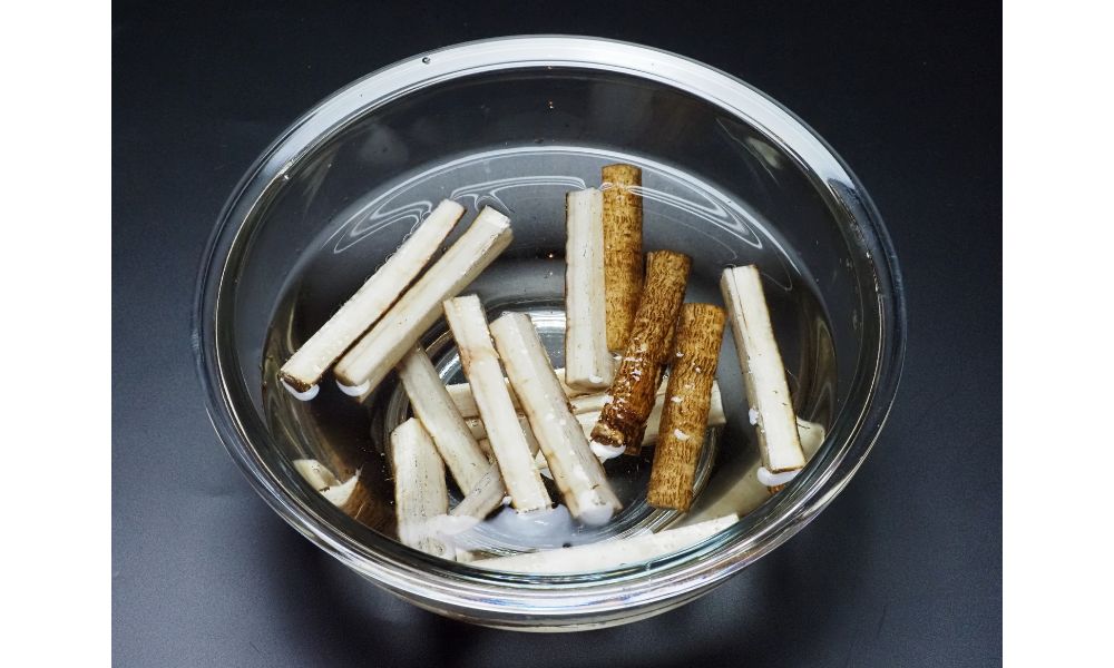 ごぼうを切り終えたら、変色しないように酢水に漬けておきます。