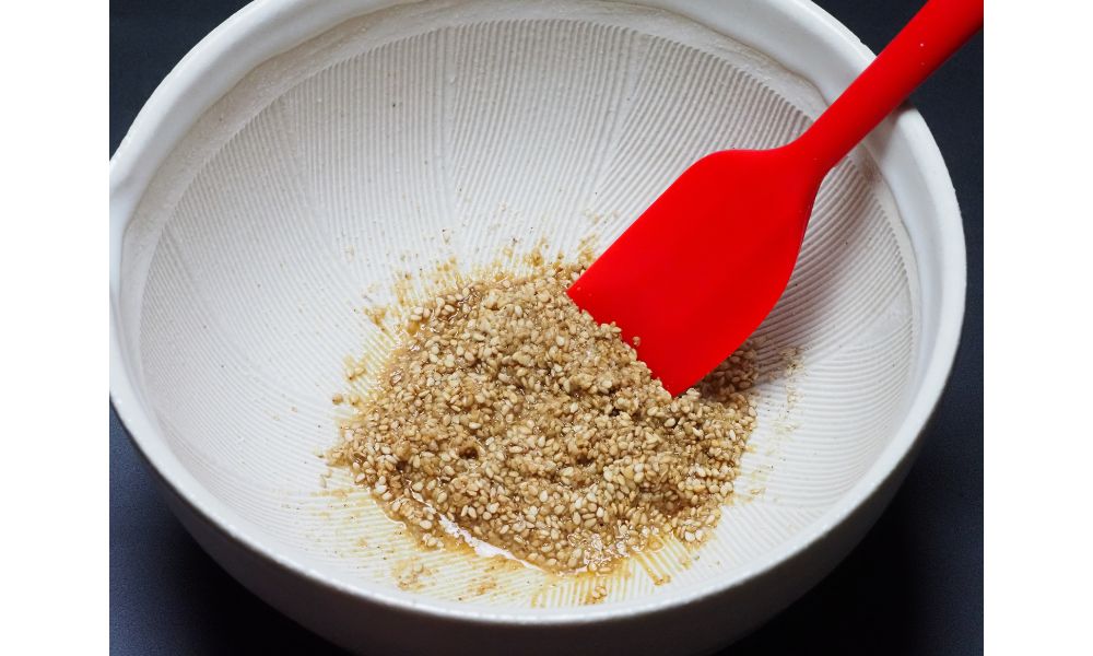 下茹でしている間に、すり鉢で炒りごまを半ずりにし、調味料を合わせておきます。