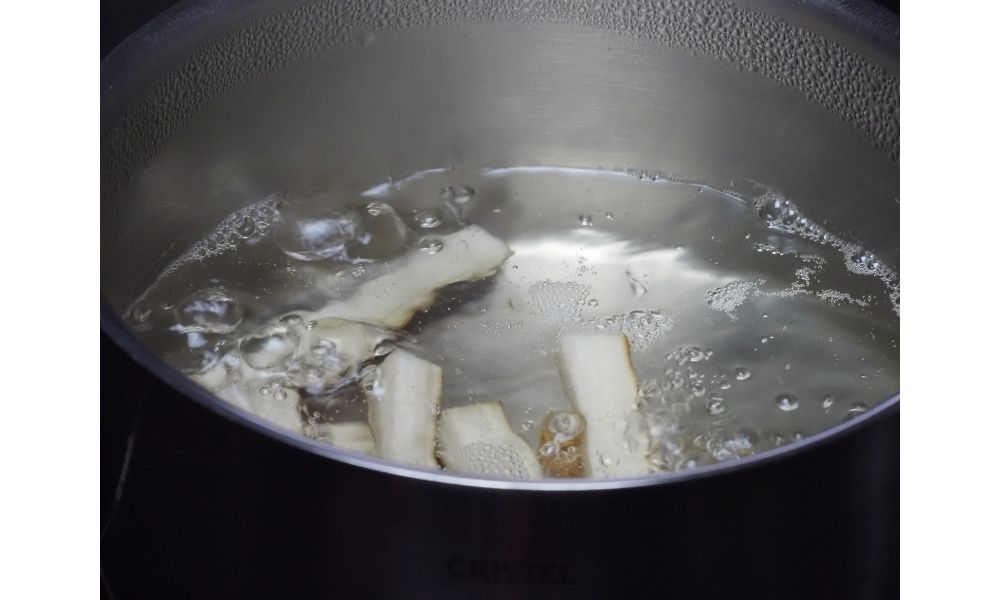 鍋に水0.5Lと酢小さじ1を入れて、沸騰したらごぼうを入れて下茹でします。下茹で時間の目安は10分。ただしお好みで茹で時間は調節してください。