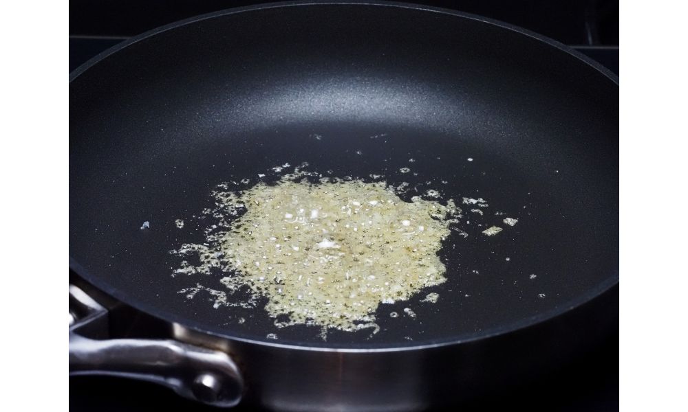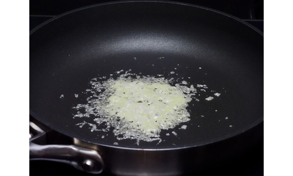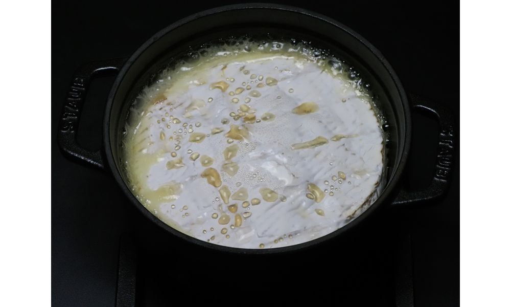 カマンベールを15分間、蒸し焼きにしている間に別のコンロでソースに火を入れていきますが、にんにくはとても焦げやすい素材なので、表面温度=120℃に設定します。