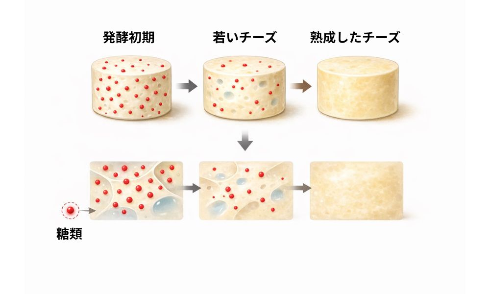 つまり、チーズの材料(牛乳だったり羊乳だったり)にある、たくさんの糖を細菌が食べて、最後はほぼ食べ尽くしてしまい、代謝物として乳酸を残すというのが発酵・熟成という過程です。