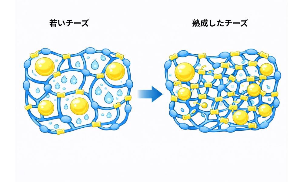 順を追って説明します。熟成すると何が起きるのか?まずチーズに含まれる水分が減ります。これによってタンパク質カゼイン分子同士の距離が近くなり、カゼインの網目が若いチーズより細かくなる=脂肪球が移動しにくくなります。