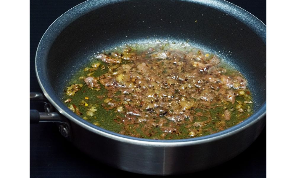 アンチョビフィレを細かく崩しながら120℃で香りが立つまで炒めておきます。