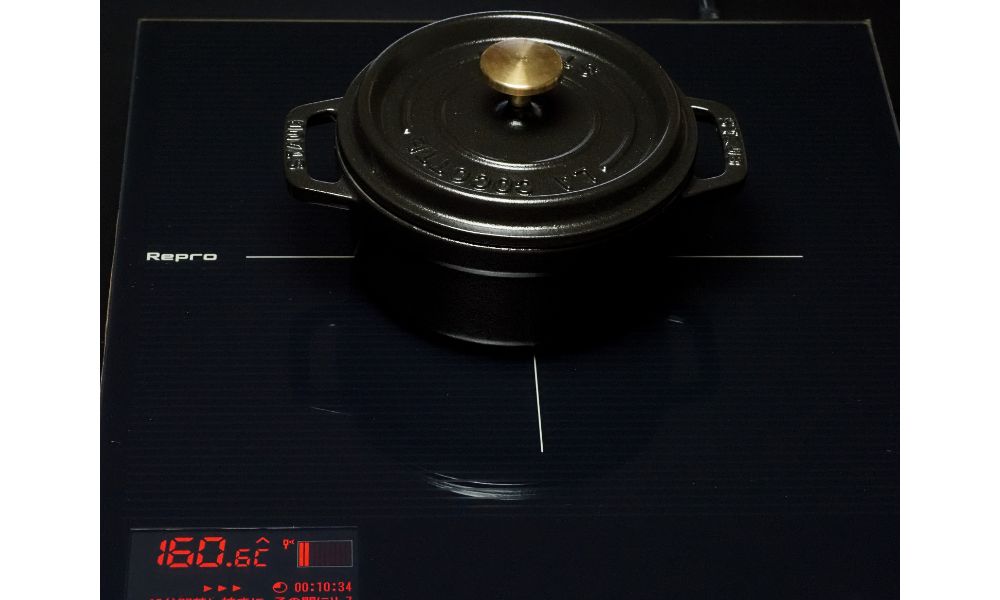 まず鍋ですが、元レシピではstaubのピコ・ココットラウンド10cmを想定しているようですが、ReproのIHコイルの直径は12cm。10cmだと小さすぎて加熱できないので12cmのココットラウンドを用意しました。