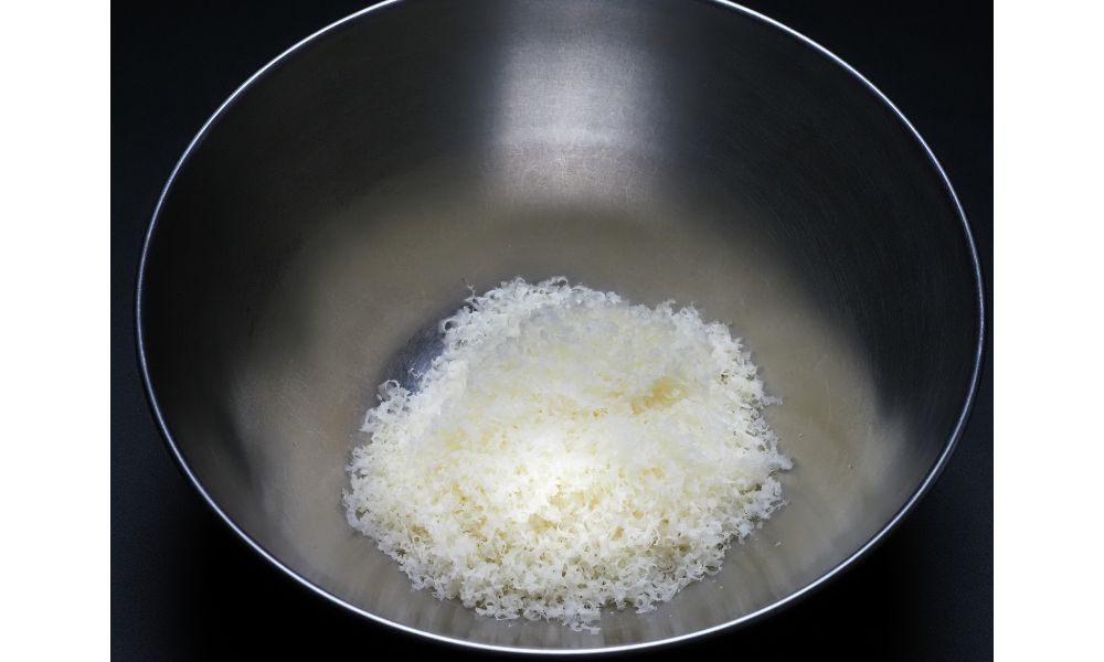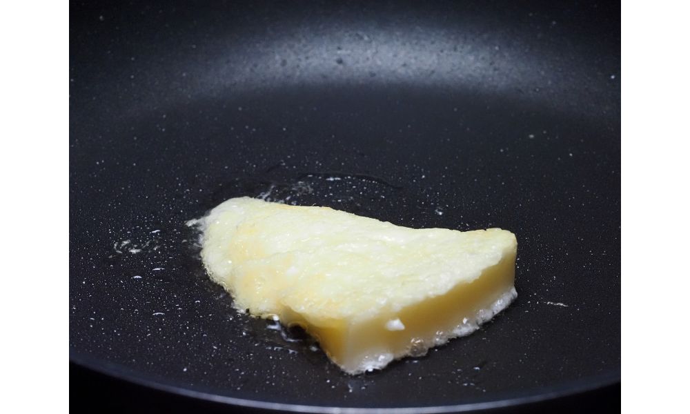 表面温度=170℃に加熱したフライパンに大さじ1〜2のパルミジャーノをサッと広げるように(あまり厚みが出ないように)投入します