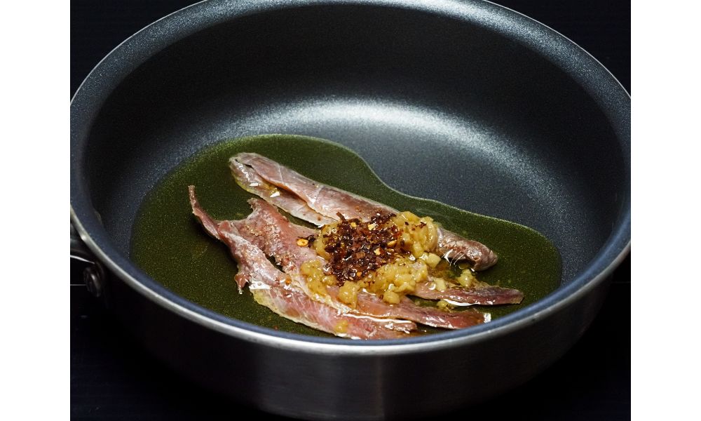 2. 別のフライパンにオリーブオイル・にんにく・ 種を取りのぞいた赤唐辛子・アンチョビフィレを弱火で炒め、香りを出す。