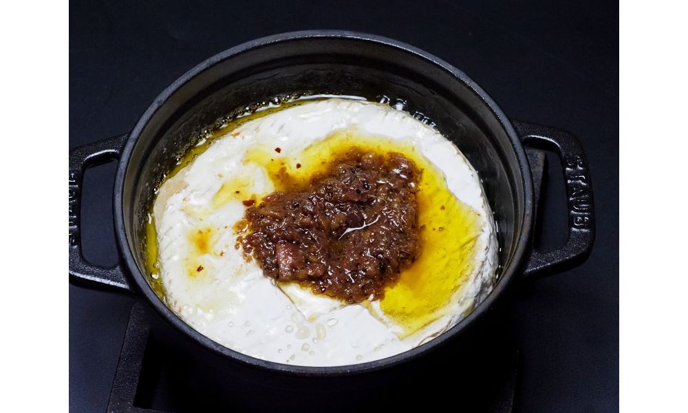 1. 常温で戻したカマンベールチーズを丸ご とココットに入れ、ふたをして弱火で15分ほど蒸し焼きにする。
