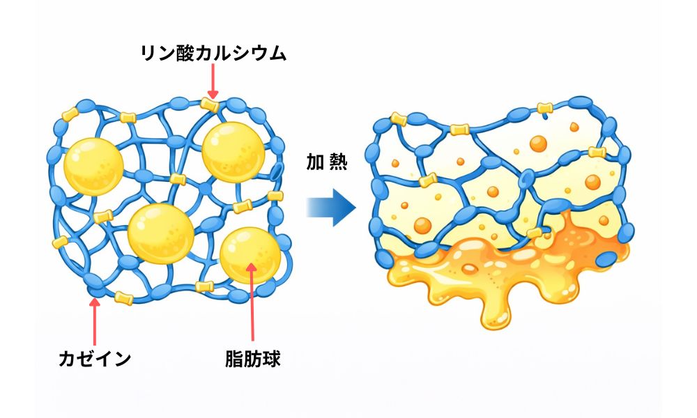 通常の状態のチーズは、この図の左側のようにカゼインが網目状の構造をしており、それをリン酸カルシウムが連結器のように連結させて脂肪の小さな粒を包みこんでいます。