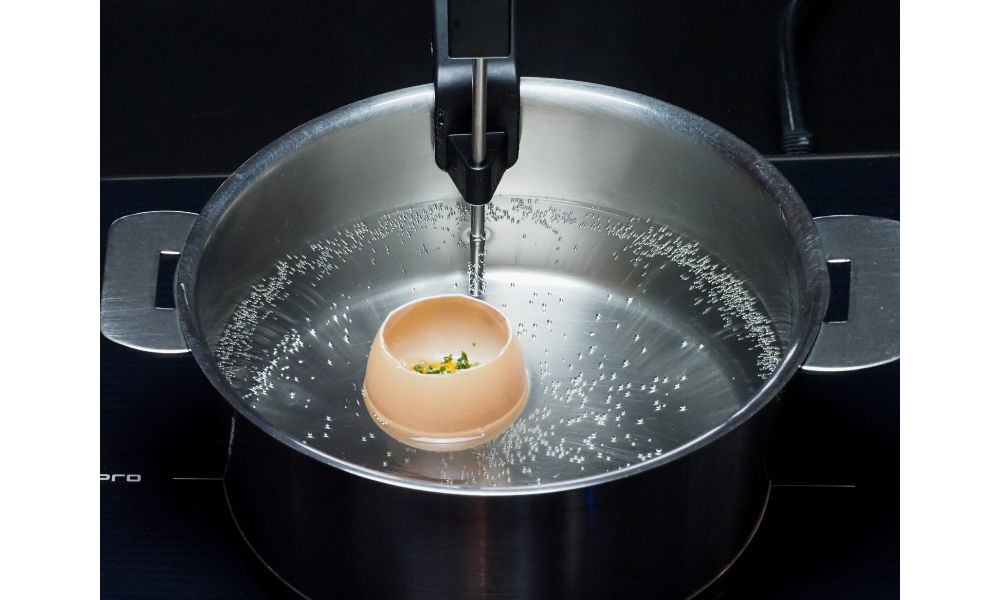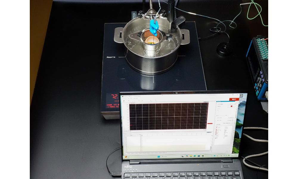 ということで、また実験してしまいました。鍋の中にちょうど良いサイズのティーストレーナーを沈め、そこにアルページュエッグを入れて、上からニードルタイプの温度センサーを卵黄の中心に刺します。そして72℃・10分間の湯せんで温度はどう推移するのか?を計測しました。