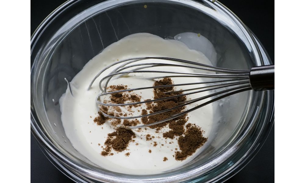 生クリームにちょっと粘性が出てきたらキャトルエピスを投入します。かなり思い切ってドバッと入れています、