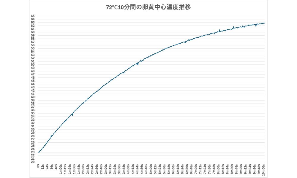 これが72℃・10分湯せんした場合の卵黄中心温度の推移です。この実験では湯せん終了時に中心温度=62.8℃でした。お湯から引き上げても余熱で若干の火が入るでしょうから、やっぱり72℃で10分間湯せんすると、このサイズなら中心温度は63℃前後になるのでしょう。