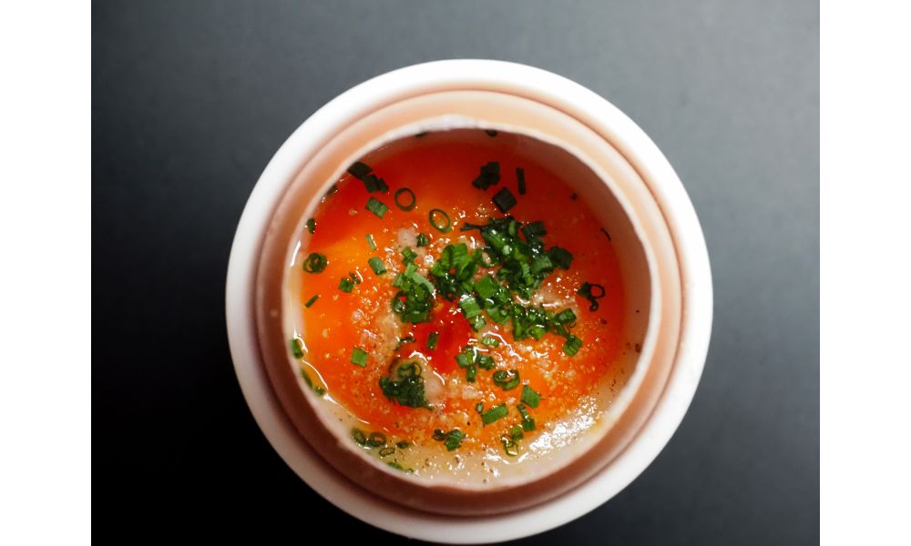 (1)樋口さんが湯せんしてからハーブ類をトッピングしているのに対し、滝本シェフはアッシェしたシブレット(あさつき)を乗せてから湯せんしている。「このネギの香りが効いてくる…」とおっしゃっていることからもシブレットの香りを湯せんで立たせることを意識しているようです。